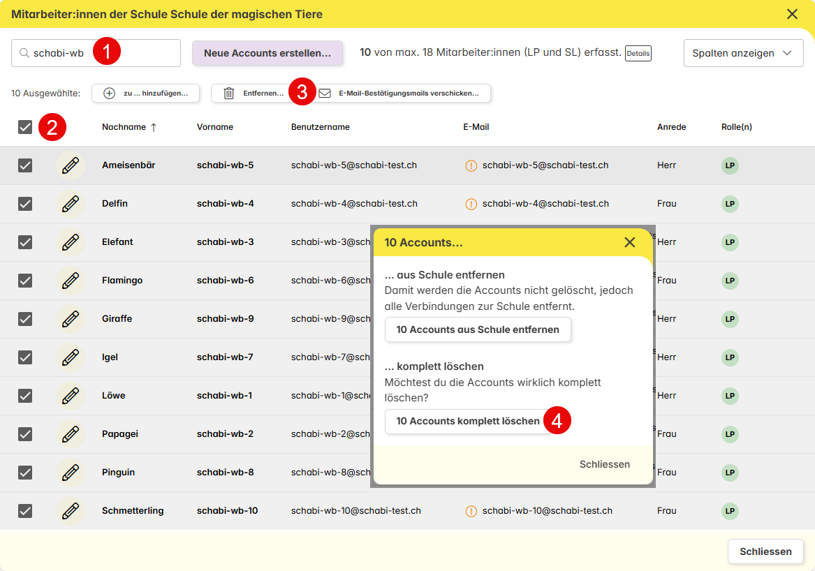 Ein paar Tage nach der Weiterbildung kannst du die Accounts jetzt wieder löschen. Klicke dazu in der Verwaltung unter "Schule als Admin" auf "Mitarbeiter:innen":